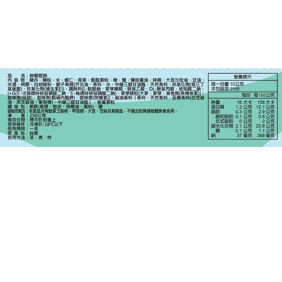 成分:麵粉、水、蝦仁、青蔥、醋酸澱粉、糖、鹽、釀造醬油、味精、大豆沙拉油、甘油、明膠、白胡椒粉、蝦子香精【芥花油、香料、水、中鏈三酸甘油脂、天然香料、抗氧化劑(第三丁基氫醌)、抗氧化劑(維生素E)】、調味料[L-麩酸鈉、麥芽糊精、氨基乙酸、DL-安基丙酸、琥珀酸二鈉、I+G(5-次黃嘌呤核苷磷酸二鈉、5'-鳥嘌呤核苷磷酸二鈉)、麥芽精粉【大麥、麥芽、著色劑(焦糖色素)】、甜味劑(紐甜)、甜味劑【(醋磺內酯鉀)、甜味劑(蔗糖素)】、麻油香料【香料、天然香料、反應香料、(白芝麻油、黑芝麻油)、葡萄糖、中鏈三酸甘油酯】、樹薯澱粉